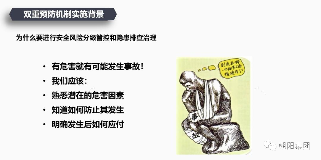在培訓活動中,朝陽集團申總詳細給員工講解了風險分級管控、隱患排查治理的概念、方法和流程等,并強調了雙重預防機制在安全生產(chǎn)中的重要性。申總首先對雙重預防機制的定義進行了闡述,再對風險分級管控與隱患排查治理的雙重預防機制進行了深入的講解。